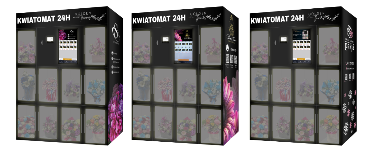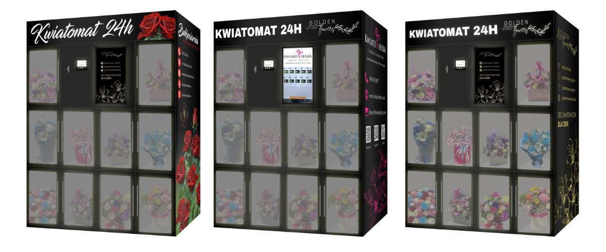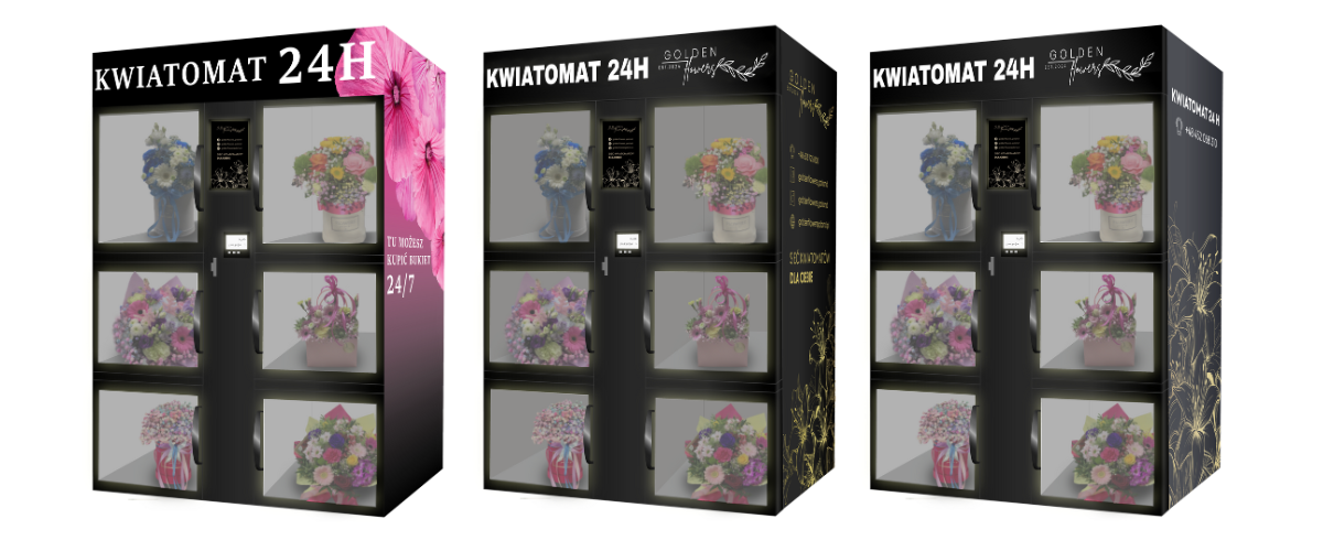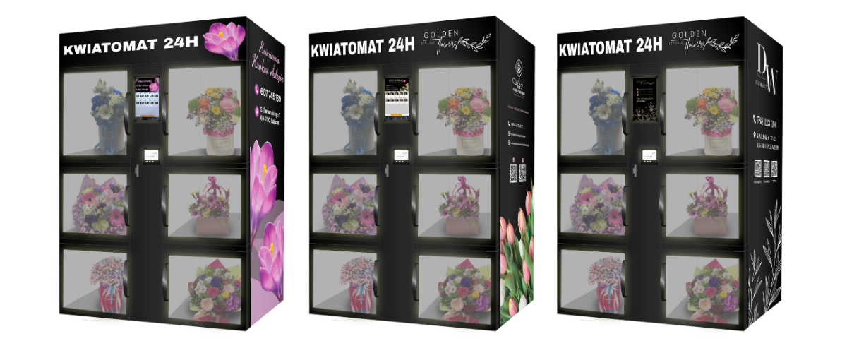 Personalisierung der Maschine – Ihr einzigartiges Branding – Möglichkeit der vollständigen Anpassung des Blumenautomaten an das visuelle Erscheinungsbild Ihres Unternehmens. Wir bieten Branding an den Seiten, auf der Rückseite und auf der Vorderseite sowie ein beleuchtetes LED-Logo und einen personalisierten Touchscreen. Sie können Ihre eigenen Farben und Muster auswählen und sogar Grafiken hinzufügen, die für Ihr Blumengeschäft werben.